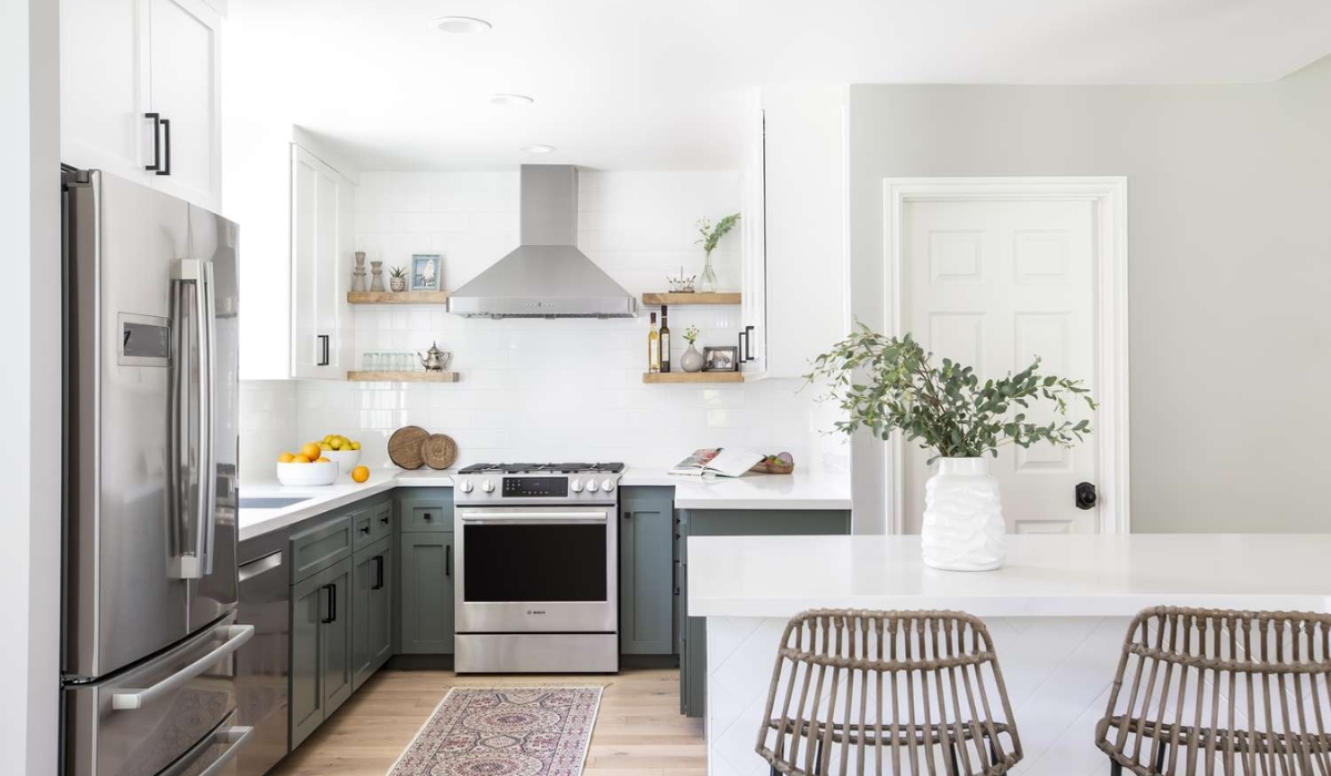 California Trend: Two-tone cabinets—white upper cabinets and deep green or navy lower ones—are a big trend in 2025.